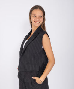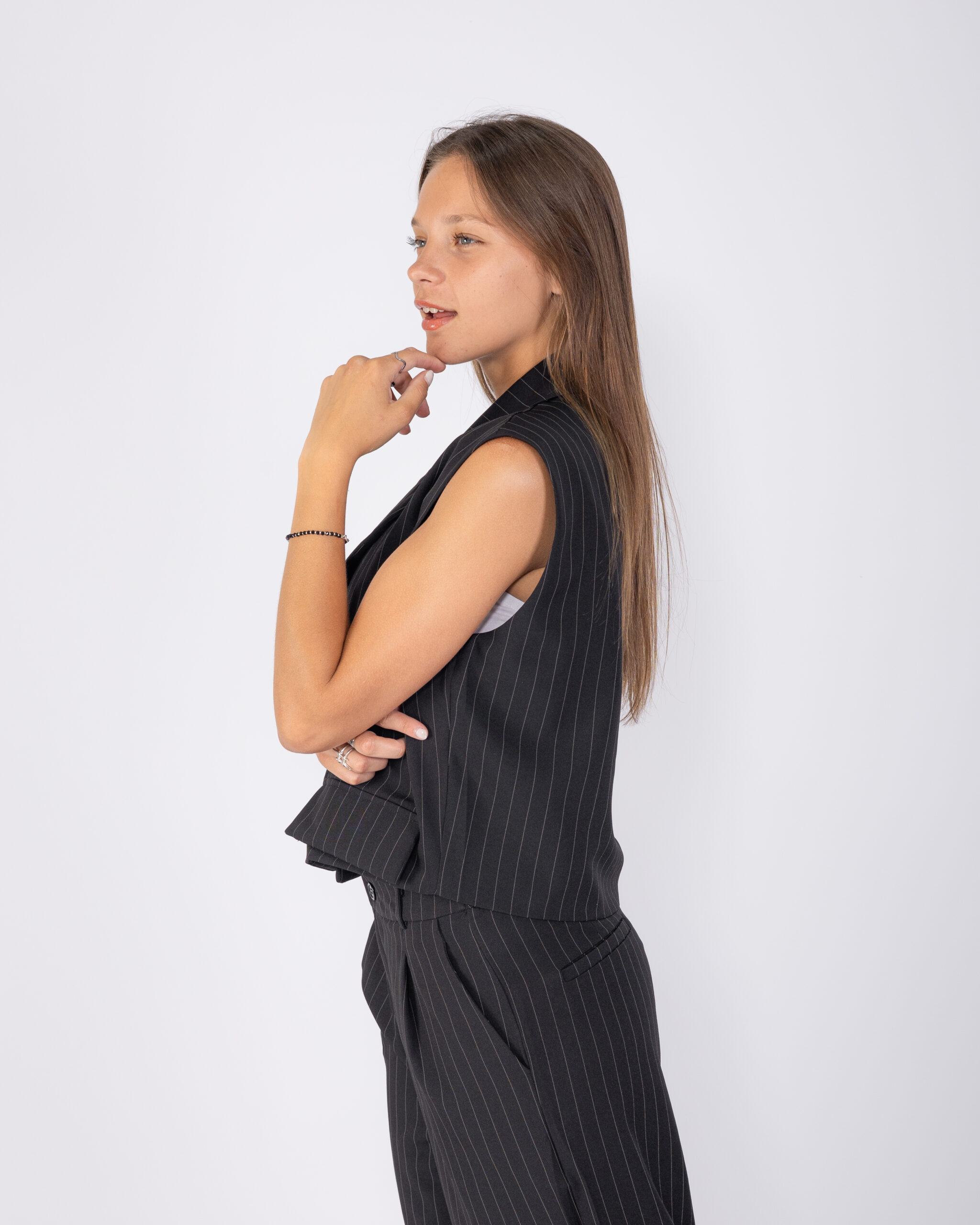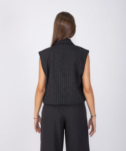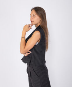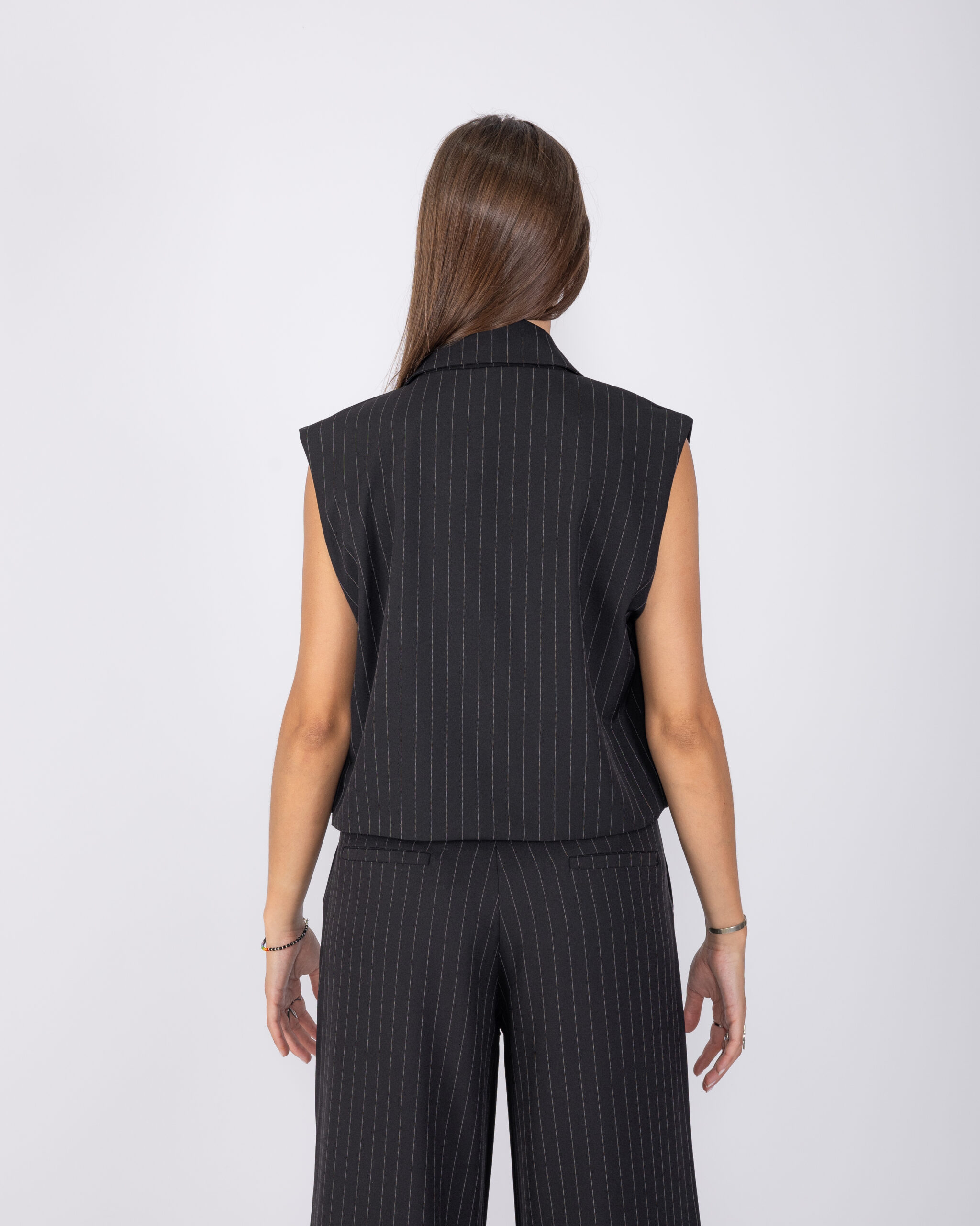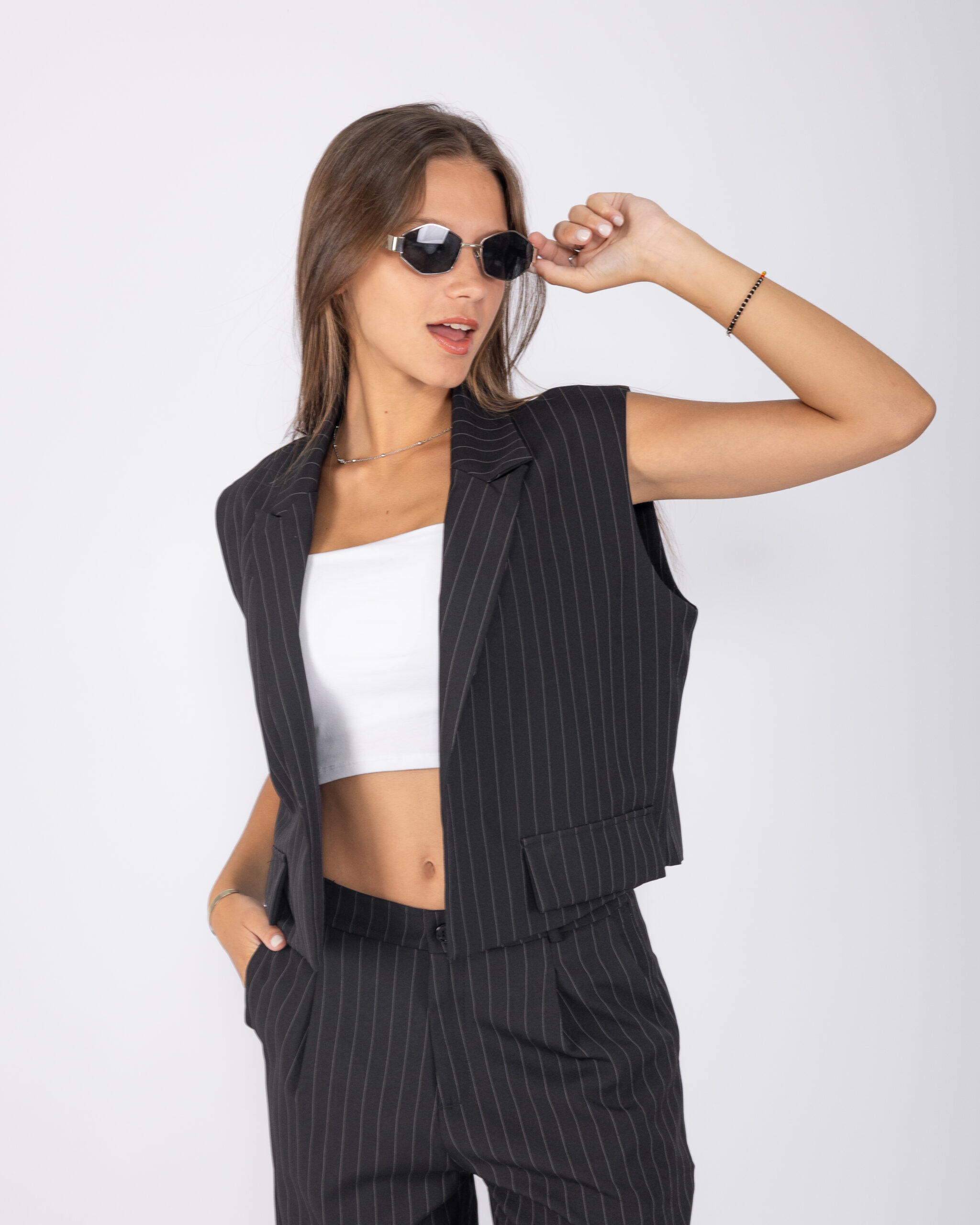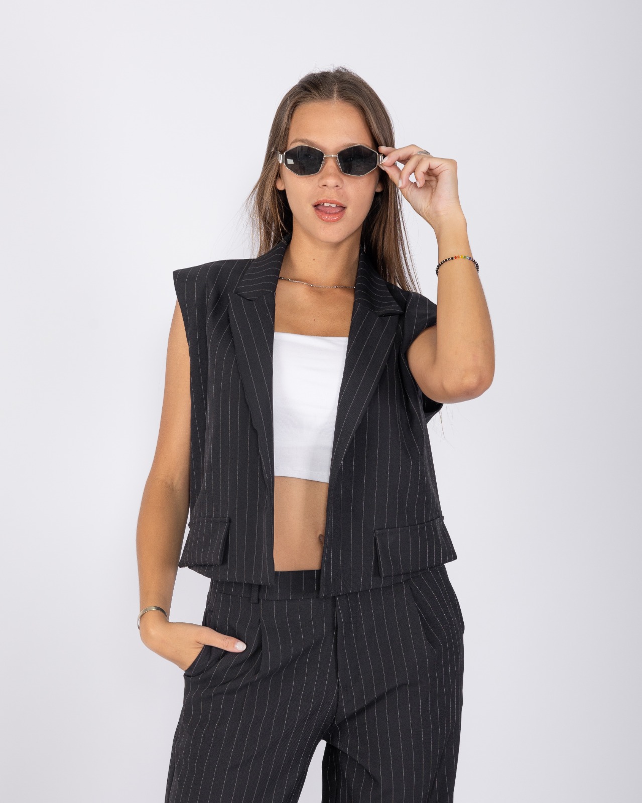 Chaleco sastrero rayado sin mangas, de corte moderno y diseño elegante. Ideal para completar looks formales o urbanos con un estilo actual.