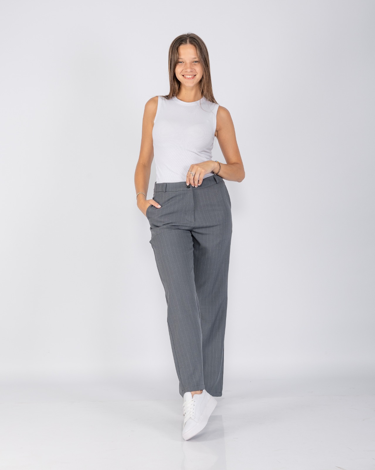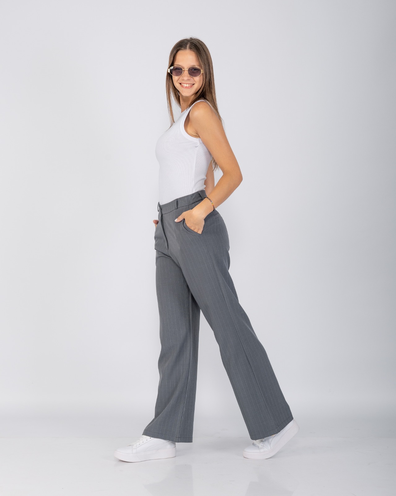 Pantalón sastrero recto rayado, de corte clásico y calce cómodo. Un diseño elegante y versátil, ideal para looks formales o combinaciones modernas.